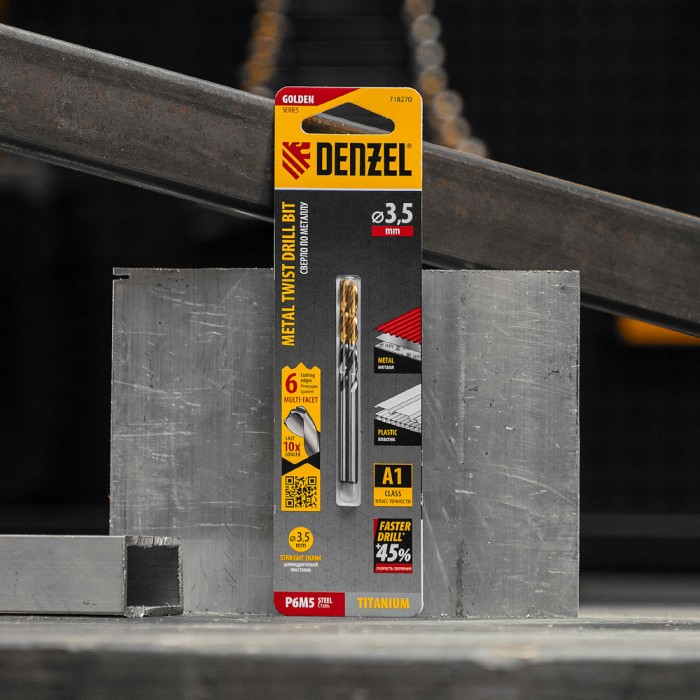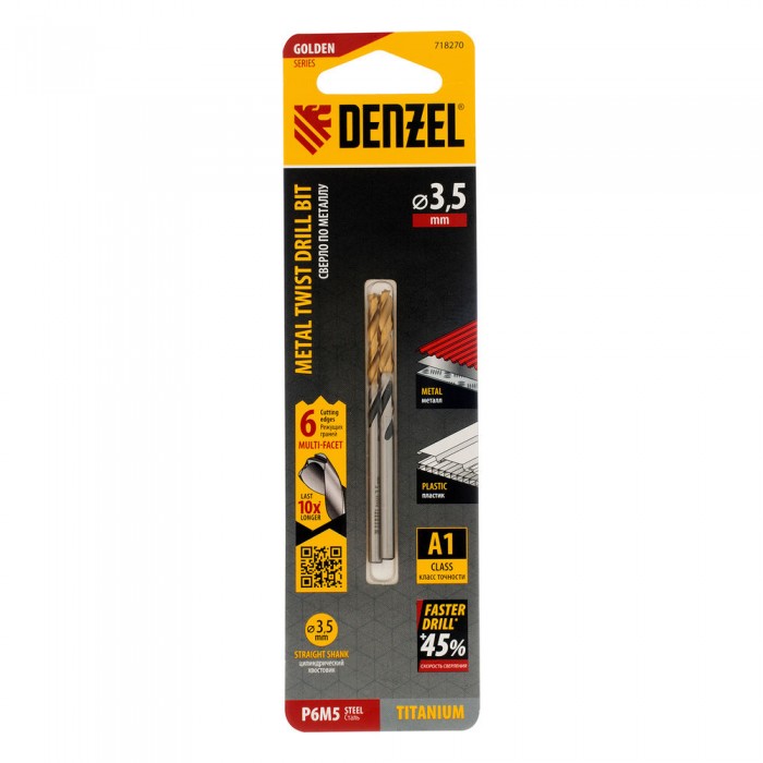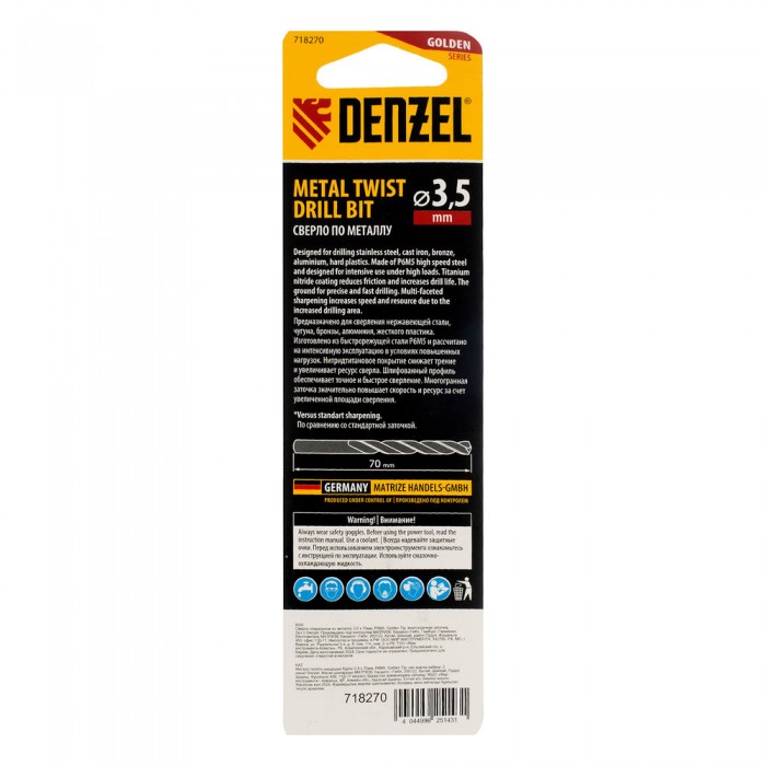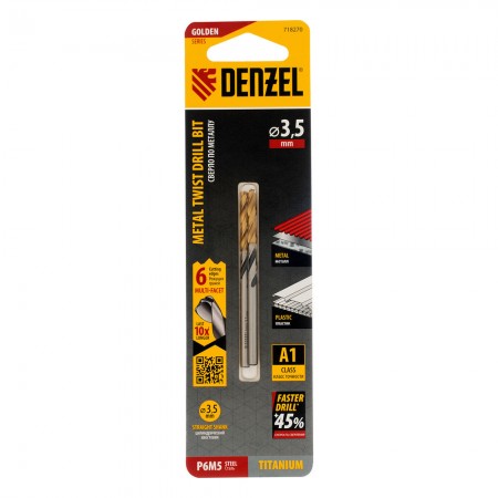 Сверло спиральное по металлу 3,5 x 70мм, Р6М5, Golden Tip, многогранная заточка, 2шт. Denzel (718270)