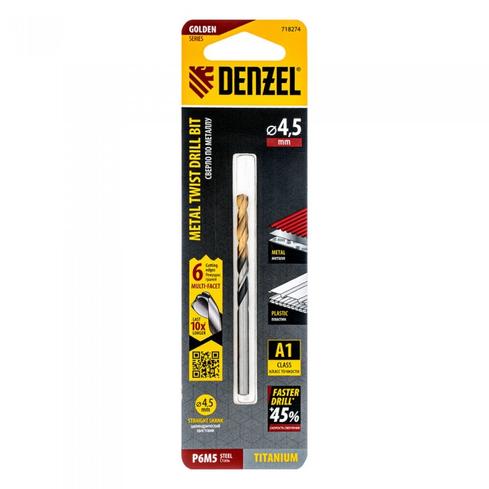 Сверло спиральное по металлу 4,5 x 80мм, Р6М5, Golden Tip, многогранная заточка Denzel (718274)