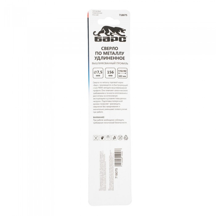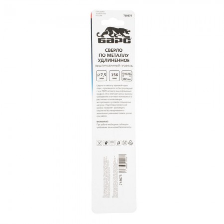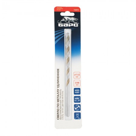 Сверло спиральное по металлу, 7.5 х 156 мм, Р6М5, удлиненное Барс (718075)