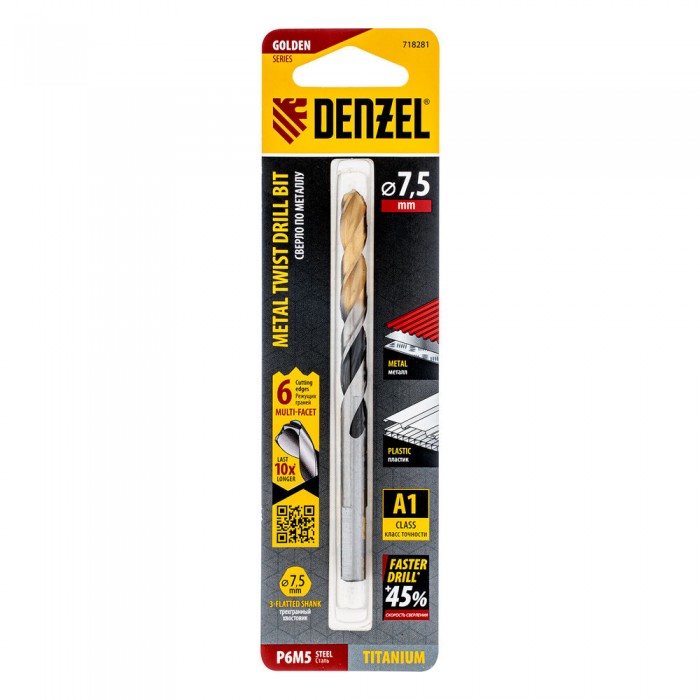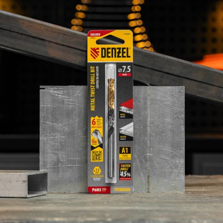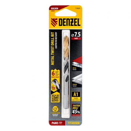 Сверло спиральное по металлу 7,5 x 109мм, Р6М5, Golden Tip, многогранная заточка Denzel (718281)