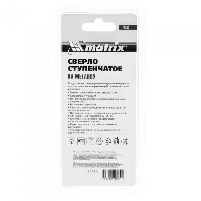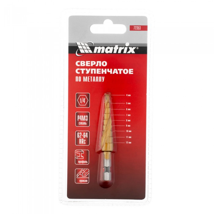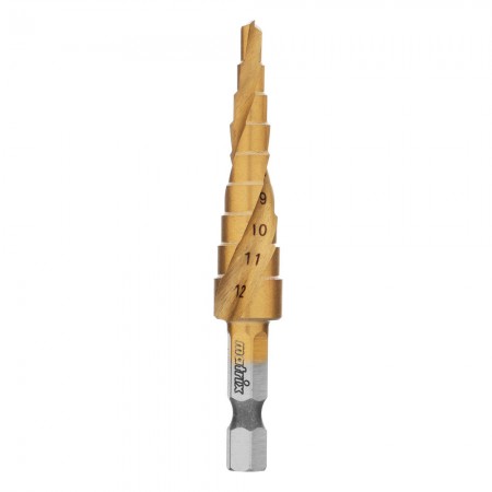 Сверло ступенчатое 4-5-6-7-8-9-10-11-12 мм, HSS, спиральный профиль, шестигранный хвостовик Matrix