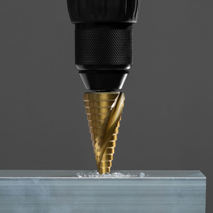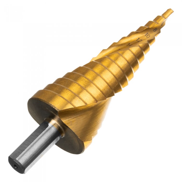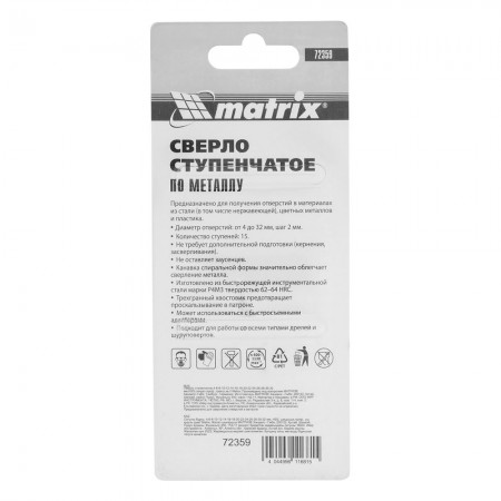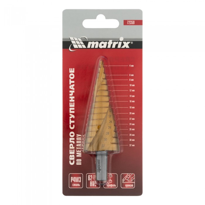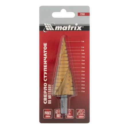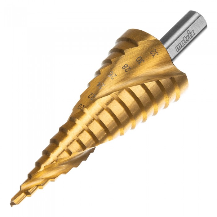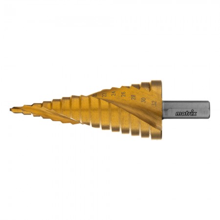 Сверло ступенчатое, 4-6-8-10-12-14-16-18-20-22-24-26-28-30-32 мм, HSS, спиральный профиль, трехгранный хвостовик Matrix