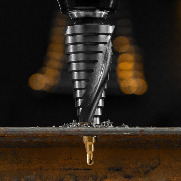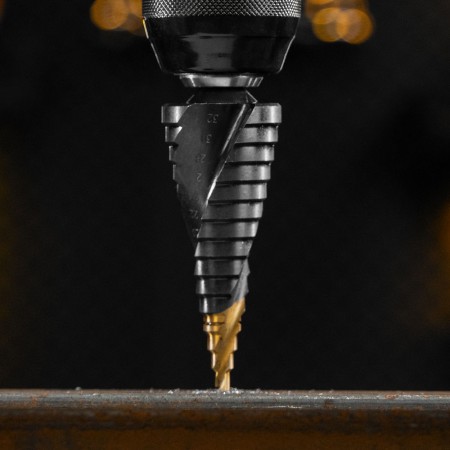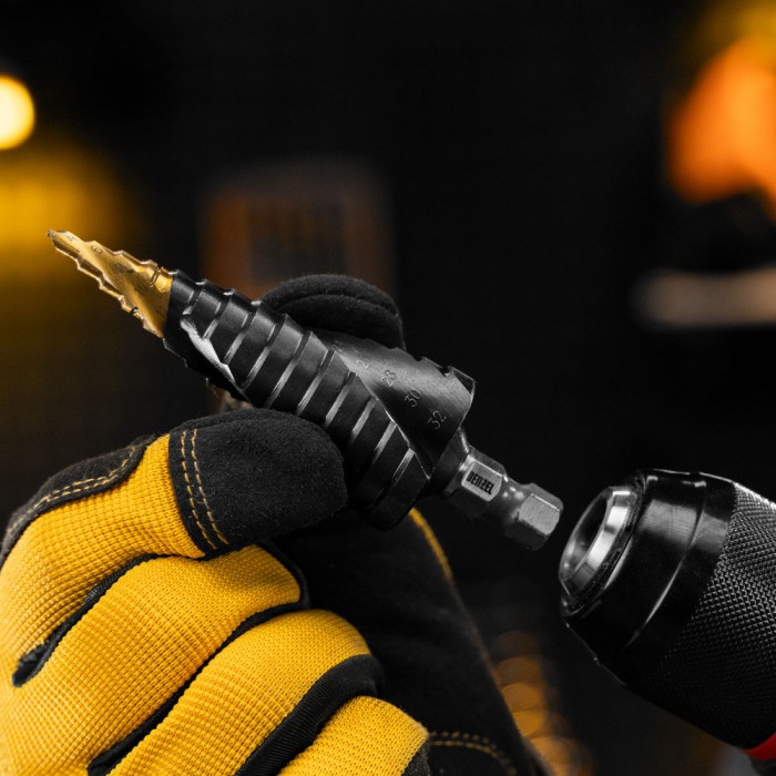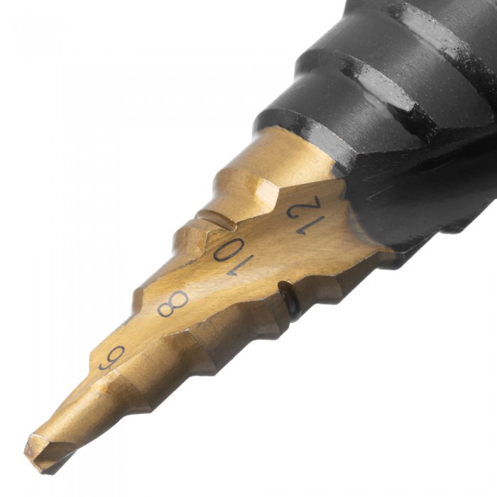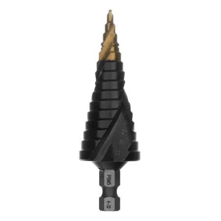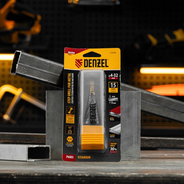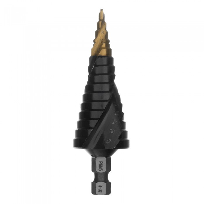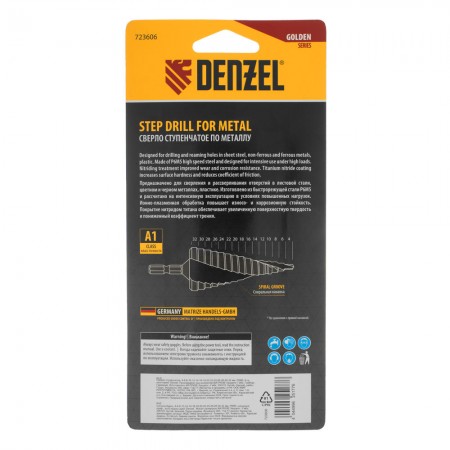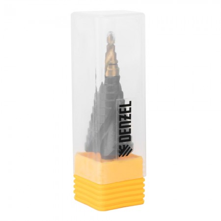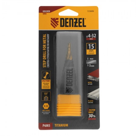 Сверло ступенчатое, 4-6-8-10-12-14-16-18-20-22-24-26-28-30-32 мм, Р6М5, 6-гр. хвостовик Denzel (723606)
