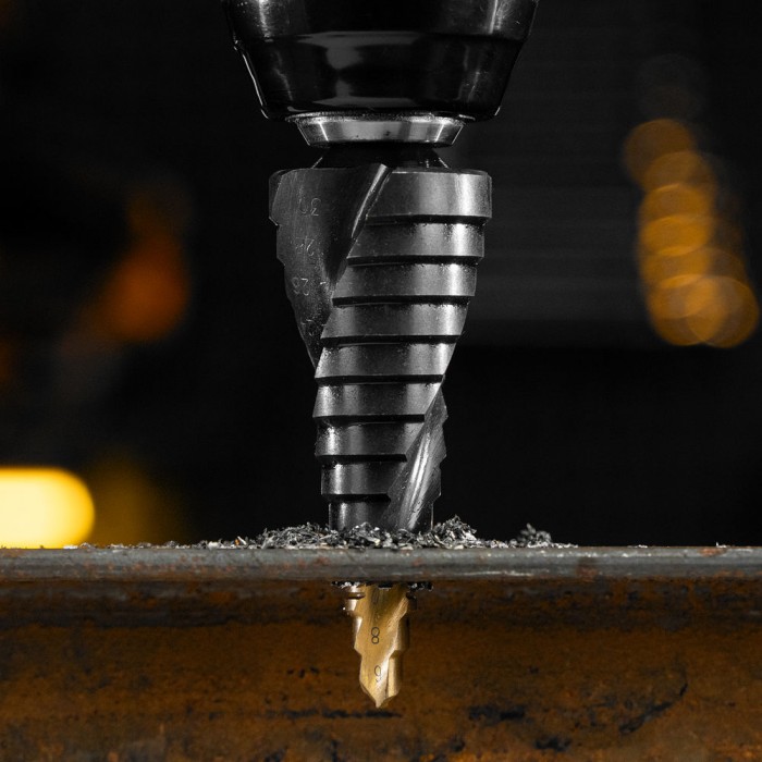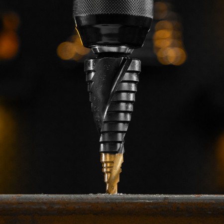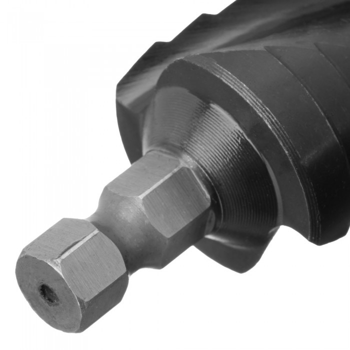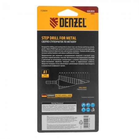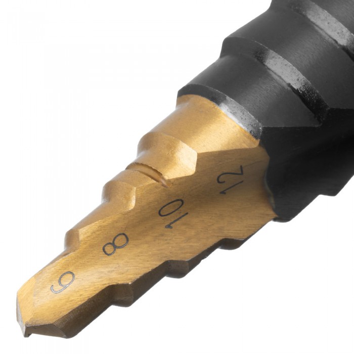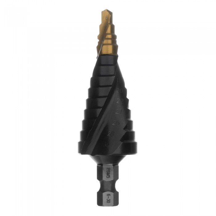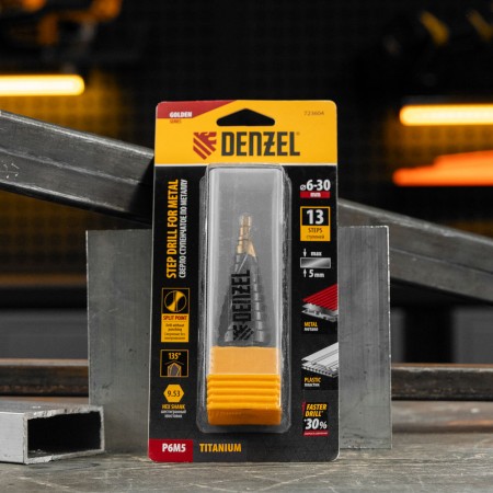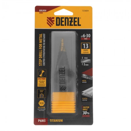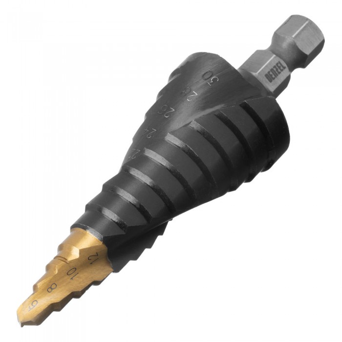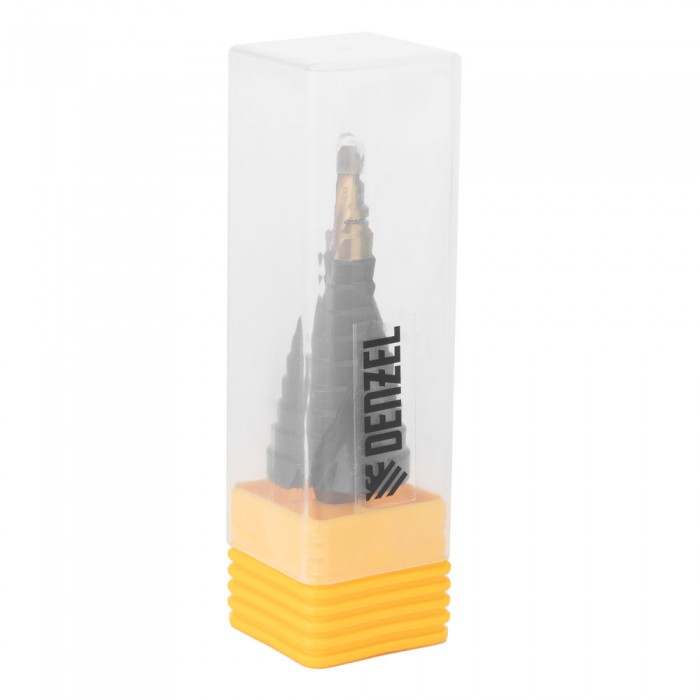 Сверло ступенчатое, 6-8-10-12-14-16-18-20-22-24-26-28-30мм, Р6М5, 6-гр. хвостовик Denzel (723604)