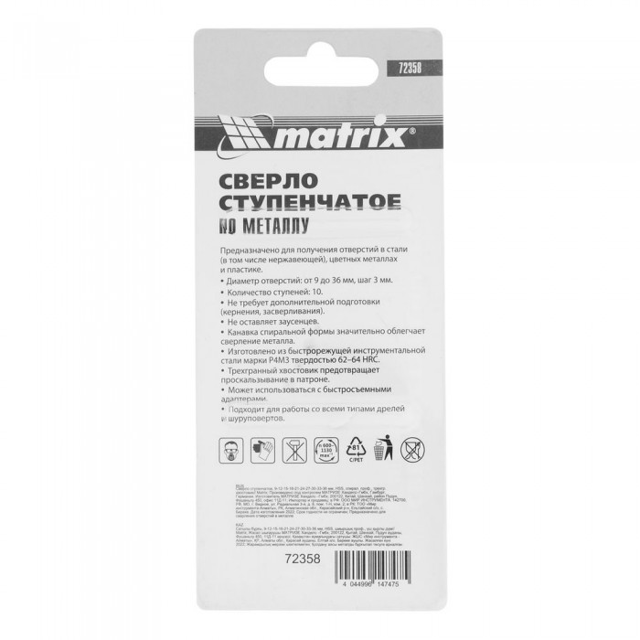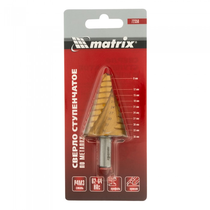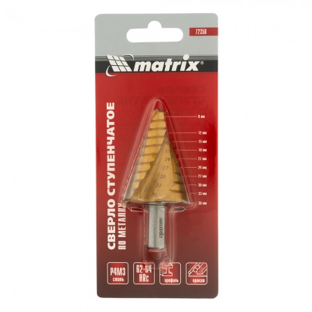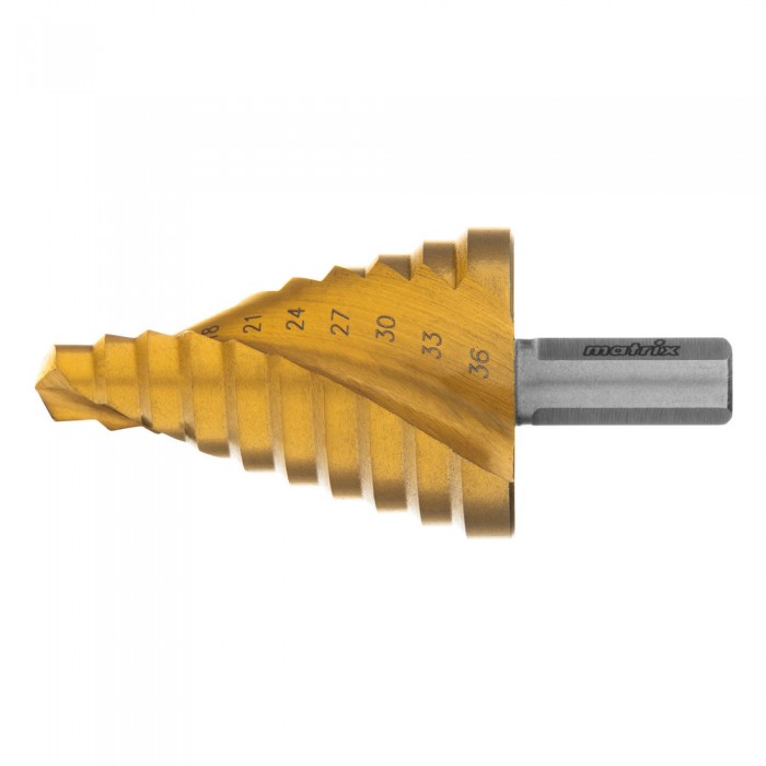 Сверло ступенчатое, 9-12-15-18-21-24-27-30-33-36 мм, HSS, спиральный профиль, трехгранный хвостовик Matrix