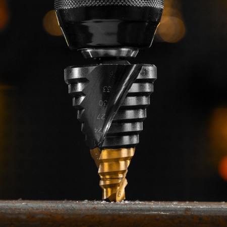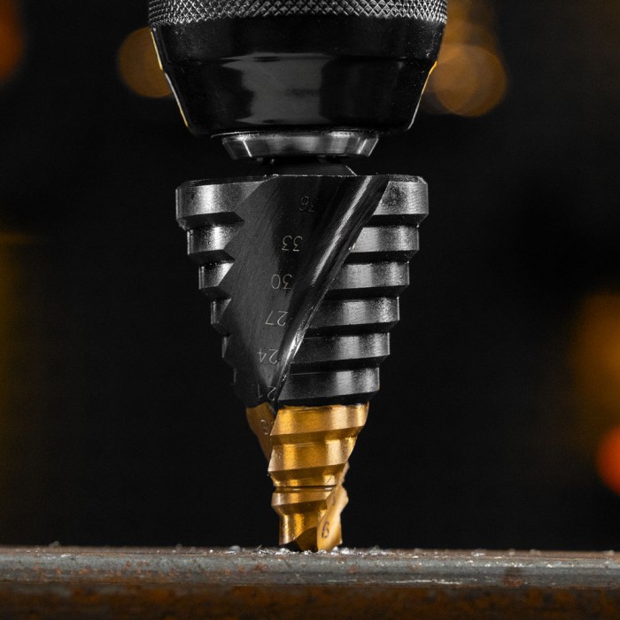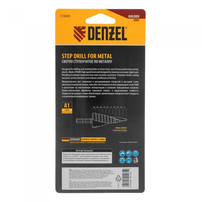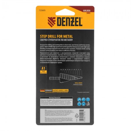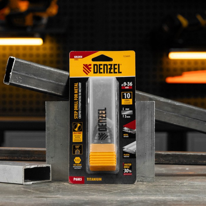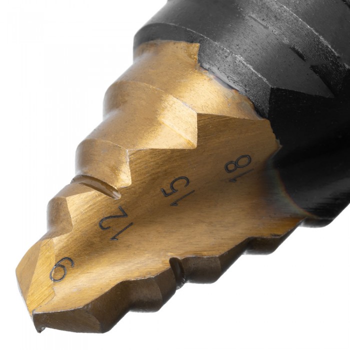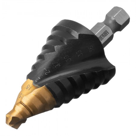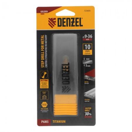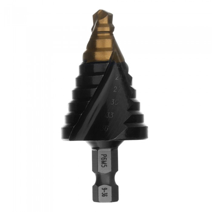 Сверло ступенчатое, 9-12-15-18-21-24-27-30-33-36 мм, Р6М5, 6-гр. хвостовик Denzel (723605)