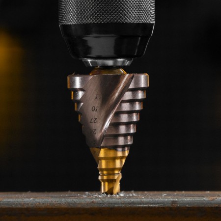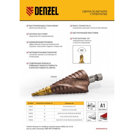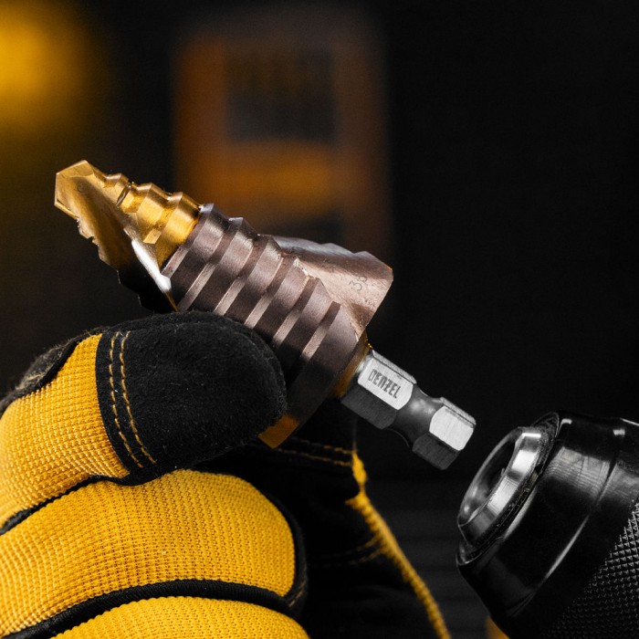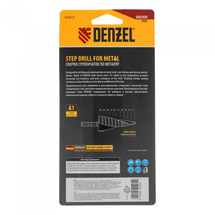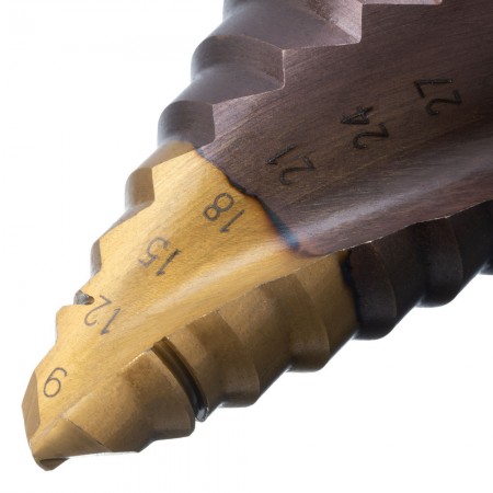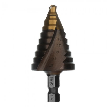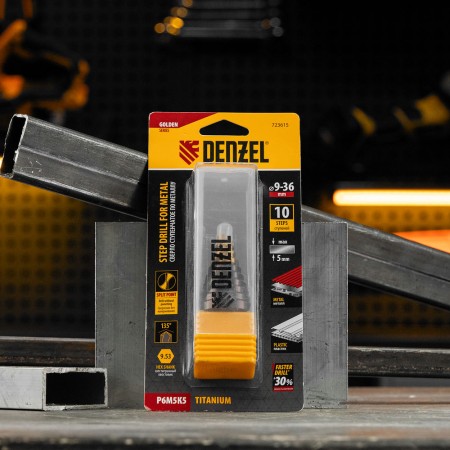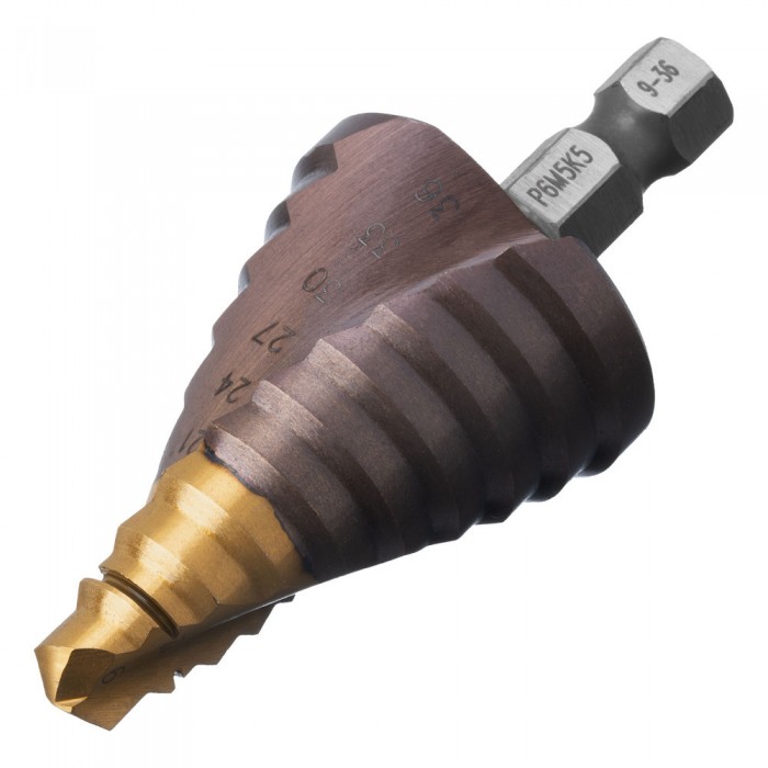 Сверло ступенчатое, 9-12-15-18-21-24-27-30-33-36 мм, Р6М5К5, 6-гр. хвостовик Denzel (723615)