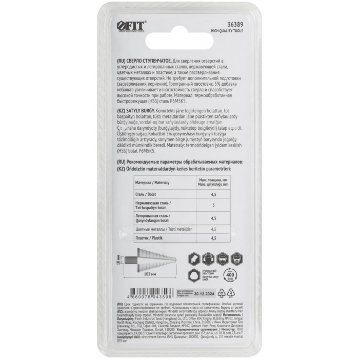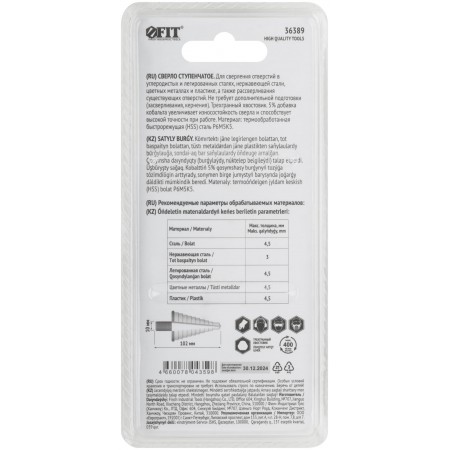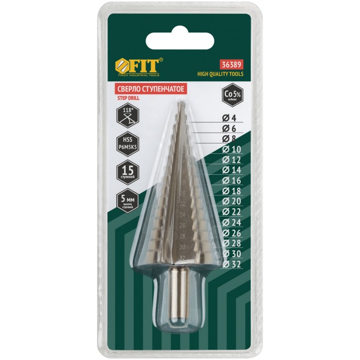 Сверло ступенчатое HSS Co5% ( Р6М5К5 ) по металлу, 15 ступеней, 4-32 мм