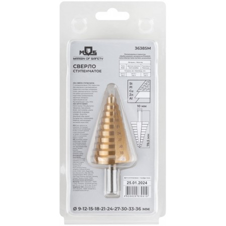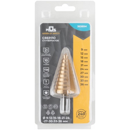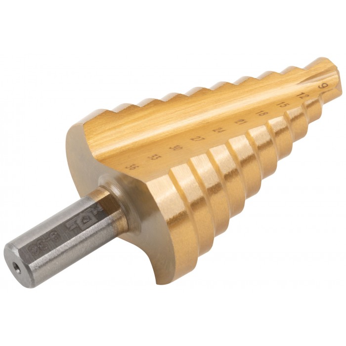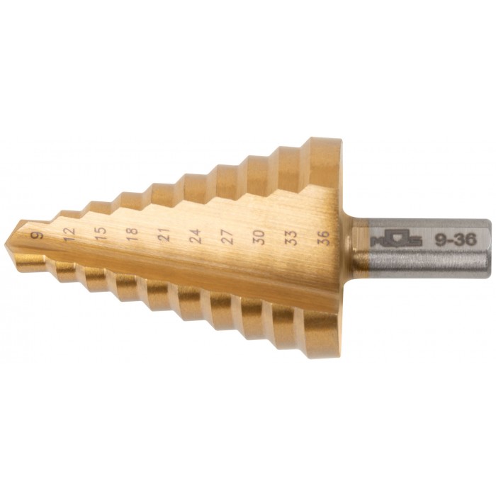 Сверло ступенчатое HSS по металлу, 10 ступеней 9-12-15-18-21-24-27-30-33-36 мм