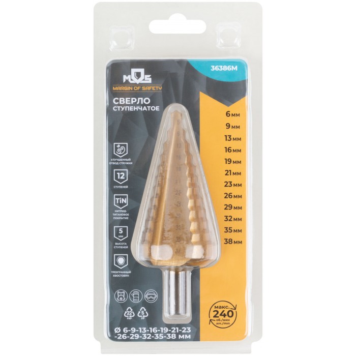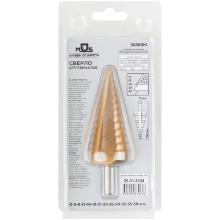 Сверло ступенчатое HSS по металлу, 12 ступеней 6-9-13-16-19-21-23-26-29-32-35-38 мм