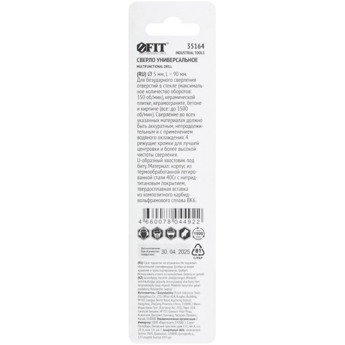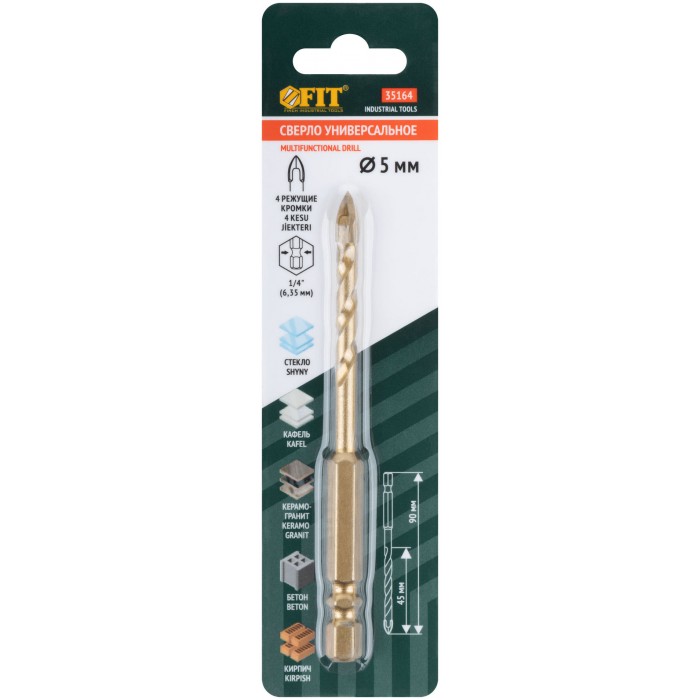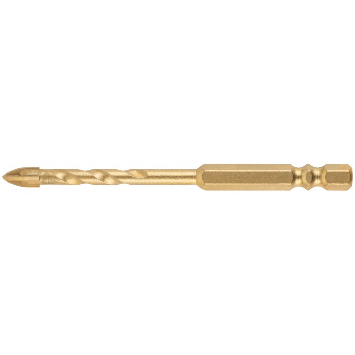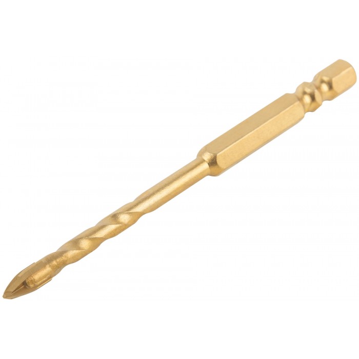 Сверло универсальное, 4 режущие кромки, титановое покрытие, шестигранный U-хвостовик под биту, 5х90 мм (35164)