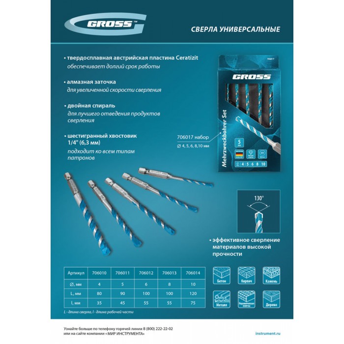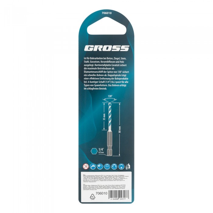 Сверло универсальное, Multipurpose PRO, 6-гр. хвостовик, 4мм Gross (706010)