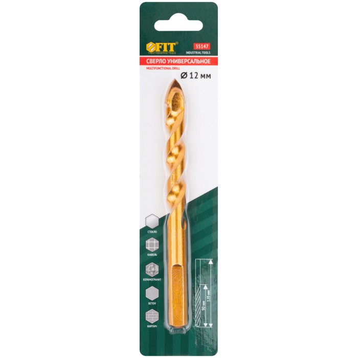 Сверло универсальное по кафелю, стеклу, керамограниту, бетону, кирпичу, трехгранный хвостовик, 12 х 120 мм (35147)