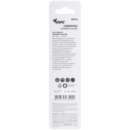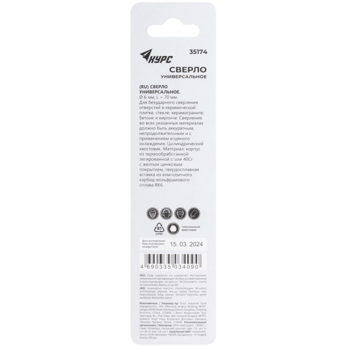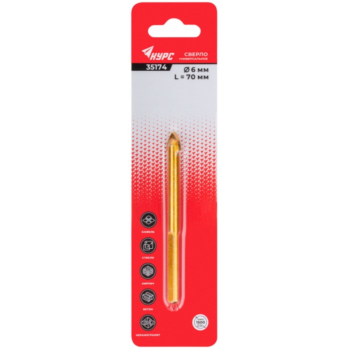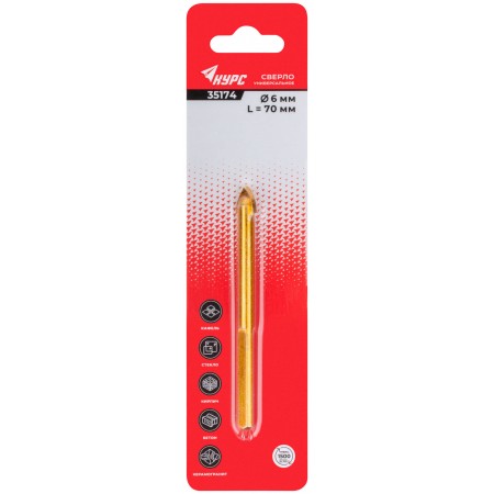 Сверло универсальное по кафелю, стеклу, керамограниту, бетону, кирпичу, трехгранный хвостовик, 6х70 мм (35174)