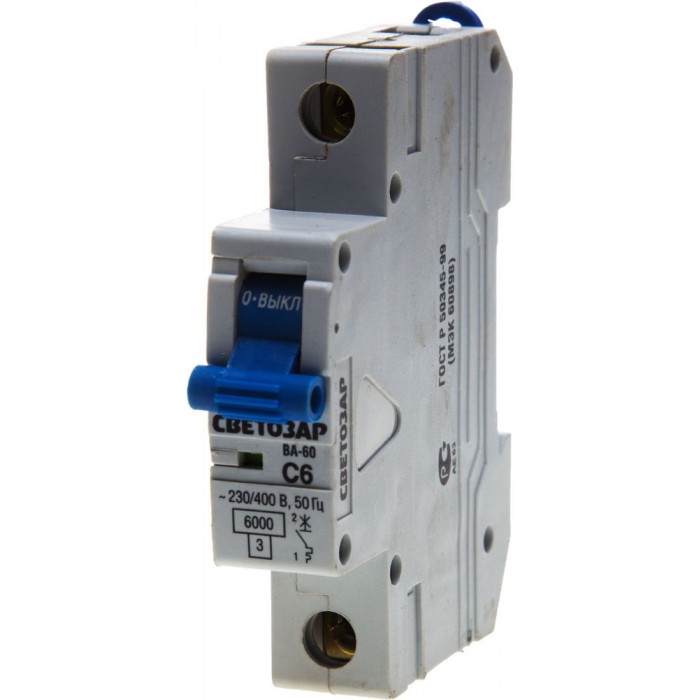 Автоматический 1-полюсный выключатель СВЕТОЗАР ″C″, 6 кА, 230/400 В применяется, в основном, на промышленных объектах в качестве защиты от перегрева проводов, кабелей двигателей и т.д.Мгновенный расцепитель срабатывает в диапазоне от 5 до 10 номинальных токов.Выключатель превосходит параметры ГОСТ (от -5°С до +40°С), поскольку устойчив к температурам от -40°С до +45°С.