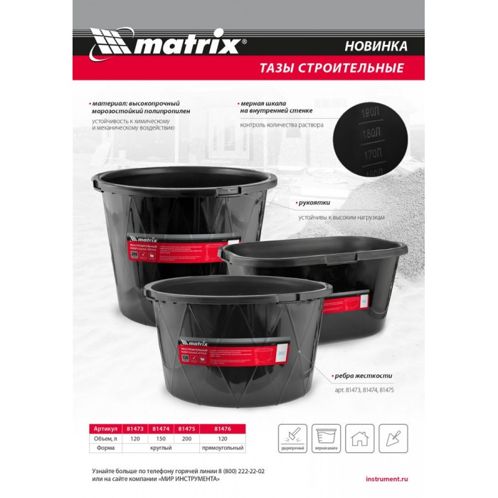 Таз строительный круглый универсальный, 150л, ударопрочный, с ребрами жесткости Matrix (81474)