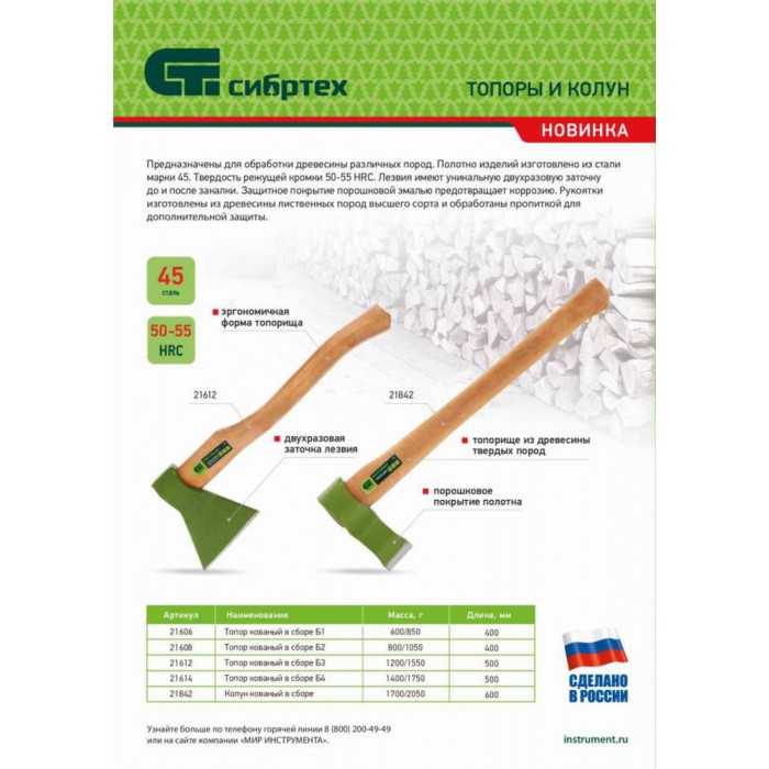 Топор кованный, в сборе, 600/850 г, деревянное топорище, 400 мм, Б1 Сибртех