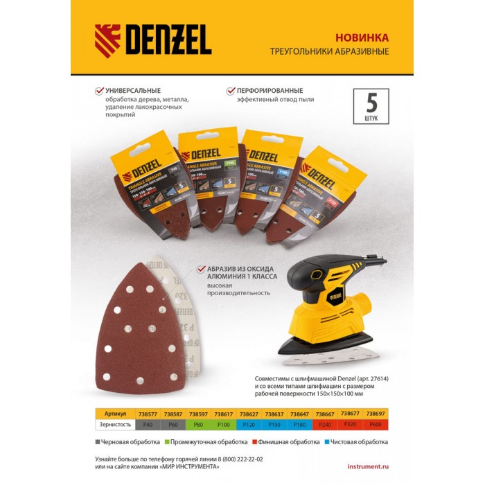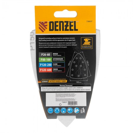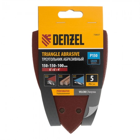 Треугольник абразивный на ворc. подложке под "липучку", перф., P 150, 150х150х100 мм, 5 шт. Denzel (738637)