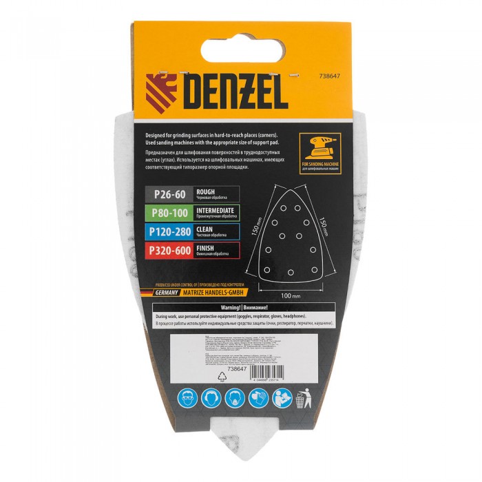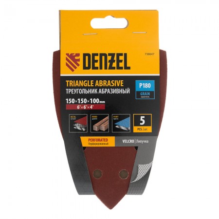Треугольник абразивный на ворc. подложке под "липучку", перф., P 180, 150х150х100 мм, 5 шт. Denzel (738647)