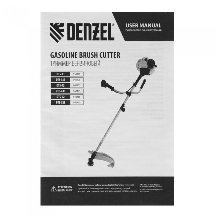 Триммер бензиновый DTS-33, 33 см3, неразъемная штанга, состоит из 2 частей Denzel (962115)