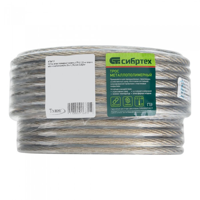 Трос металлополимерный прозрачный ПР-8.0, толщина 8.0 мм, моток 20 метров Сибртех (476413)