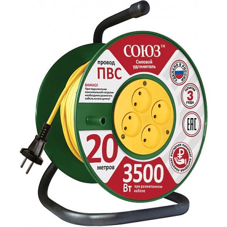Удлинитель силовой ''СОЮЗ''. Удлинитель имеет 4 гнезда розеток без заземления. Сетевой шнур изготовлен из провода ПВС (2 х 1,5). Стойка из сварной трубы с порошковой окраской. Катушка из ударопрочного пластика толщиной 2,5 мм. Напряжение в сети: 220-250 В, максимальная мощность 3500 Вт. Комплектность: изделие, упаковочный пакет, гофрокороб, паспорт изделия.