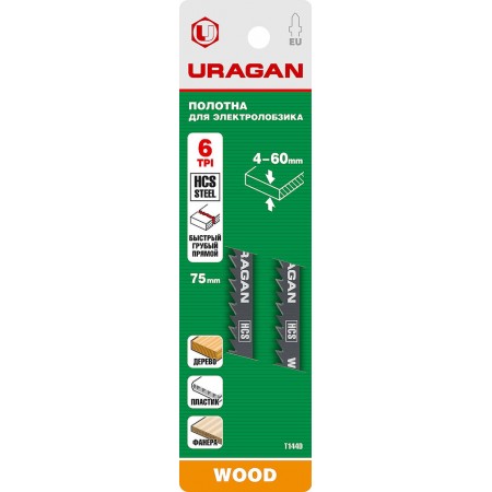 -Классификация по Bosch: T101D -Размер полотна: 75 x 4 mm, Полотна URAGAN для электролобзиков имеют увеличенную толщину рабочей части, что даёт повышенную устойчивость к излому, а также обеспечивает улучшенную геометрию и чистоту пропила.