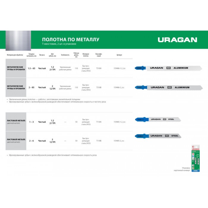 -Размер полотна: 50 x 2 mm -Классификация по Bosch: T118B, Полотна URAGAN обладают увеличенным рабочим ресурсом и имеют повышенную стойкость к излому.