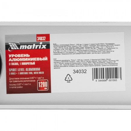 Уровень алюминиевый "Рельс", 1200 мм, 3 глазка (1 поворотный) Matrix (34032)