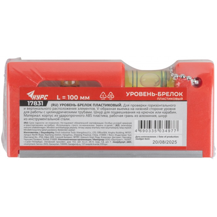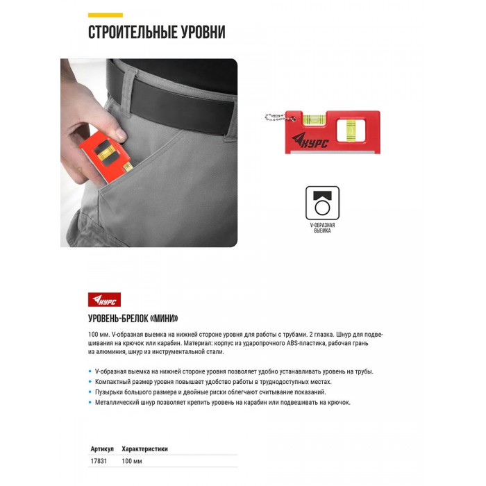Уровень-брелок пластиковый, 2 глазка 100 мм (17831)