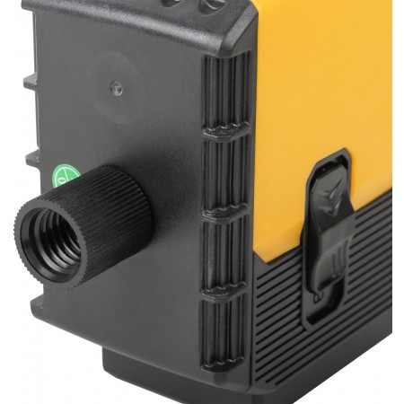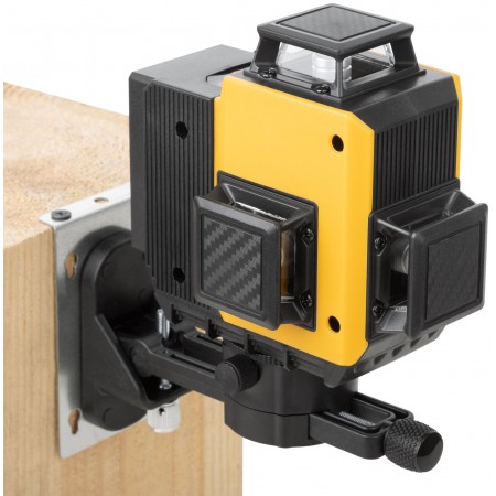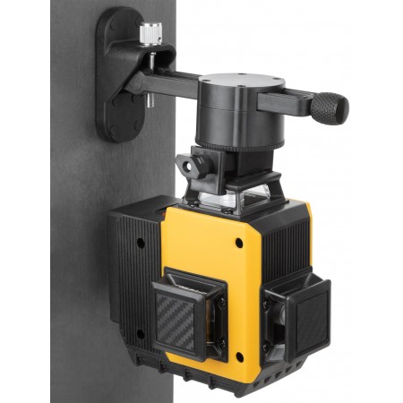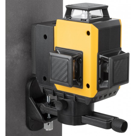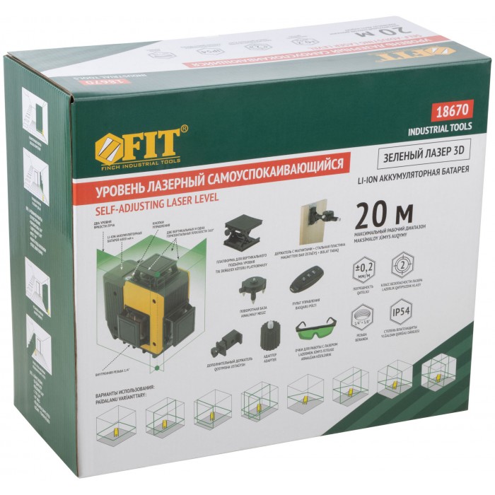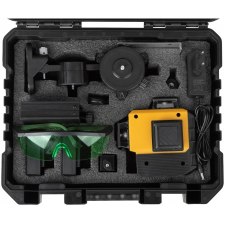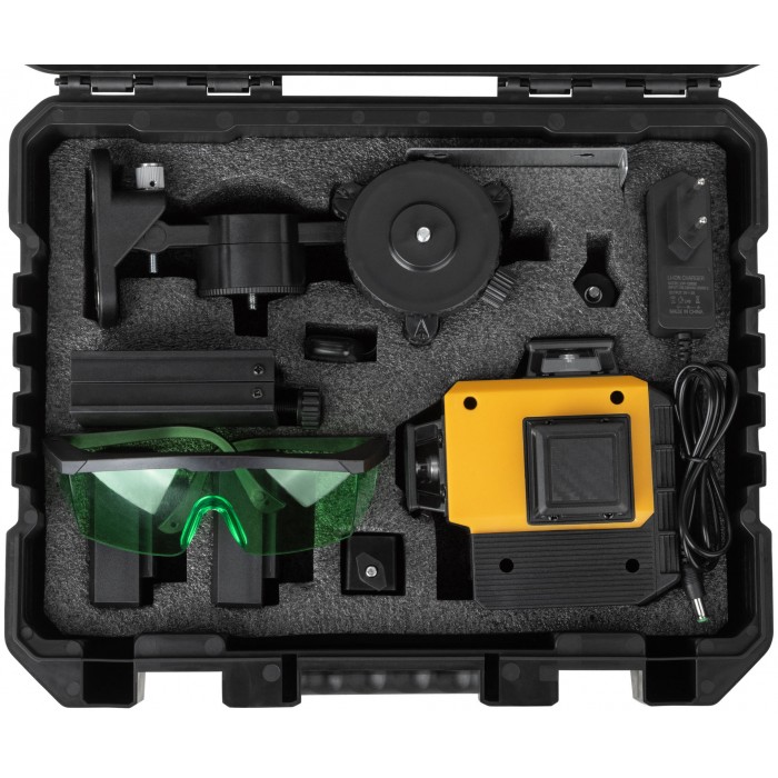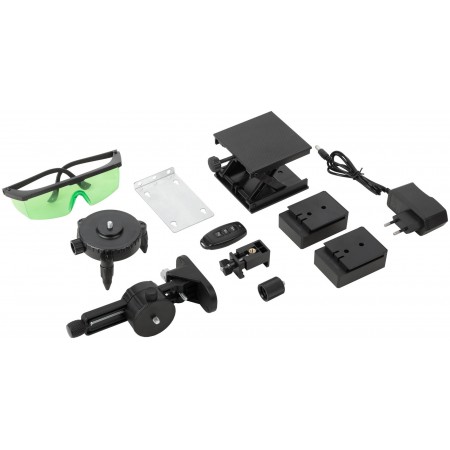 Самоуспокаивающийся. 3 зеленых луча на 360°: 2 вертикальных и 1 горизонтальный. Возможность менять яркость лучей - для внутренних и наружных работ. Максимальный рабочий диапазон - до 20 м в каждую сторону. Функция фиксирования на поверхности креста из лазерных линий (а также отдельно горизонтальной или вертикальной линий). Функция отвеса вверх/вниз. Функция раздельного включения линий. В комплекте пульт дистанционного управления, действующий на расстоянии до 12 м. С помощью держателя с магнитами и платформы для вертикального подъема можно располагать уровень на необходимой позиции. Диапазон компенсирования ±3° для установки на неровную поверхность. Внутренняя резьба 1/4'' снизу на корпусе. Поворотная база и адаптер с внешней резьбой 1/4'' и с внутренней резьбой 5/8'' для установки на треногу. В комплекте: лазерный уровень, пластиковый кейс с поролоновыми вставками, поворотная база, платформа для вертикального подъема уровня, держатель с магнитами, стальная пластина для крепления держателя к вертикальной поверхности, очки, зарядное устройство (230 В / 50 Гц), Li-Ion аккумуляторная батарея, пульт управления, держатель и адаптер. Материал: ударопрочный ABS пластик, пластик, алюминиевый сплав, инструментальная сталь, поролон, резина. Упаковка: пластиковый кейс.
