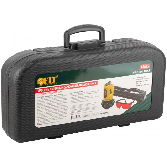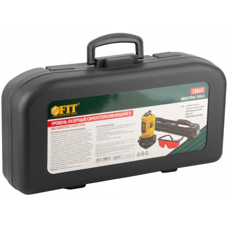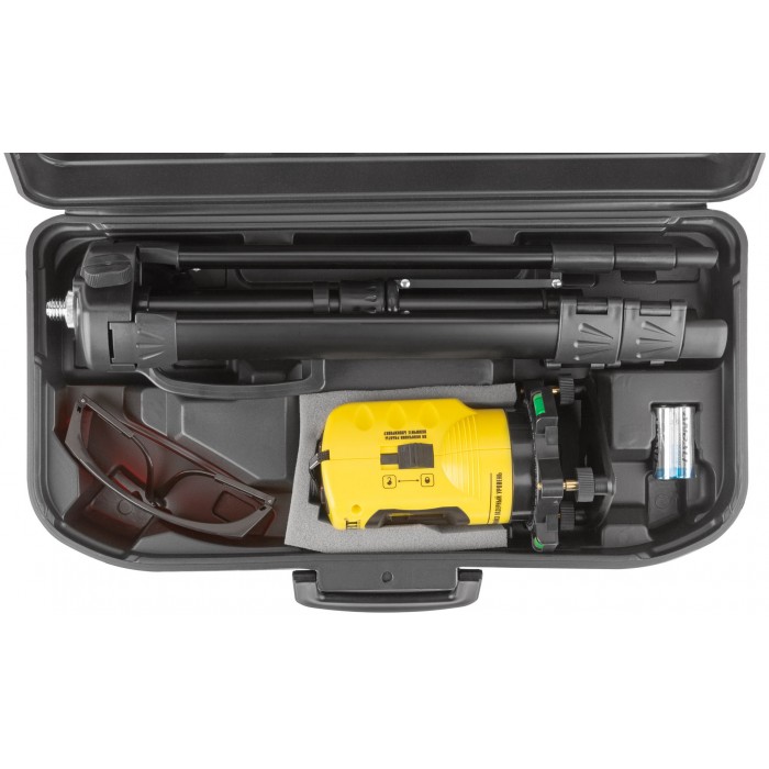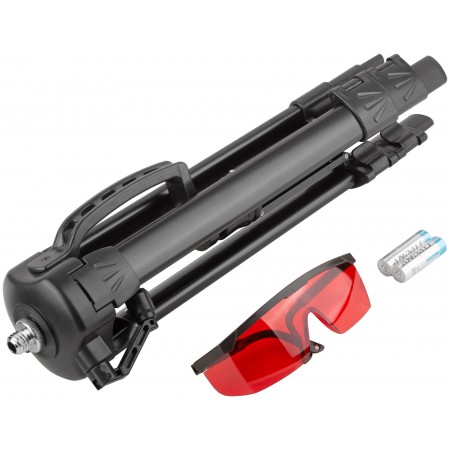 Уровень лазерный самоуспокаивающийся, красные лучи, крест, диапазон 10 м, тренога, очки, пластиковый кейс (18665)