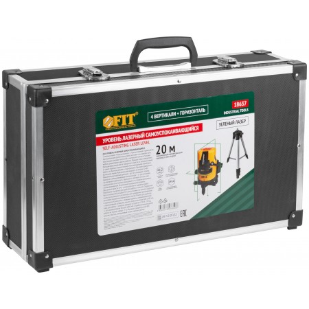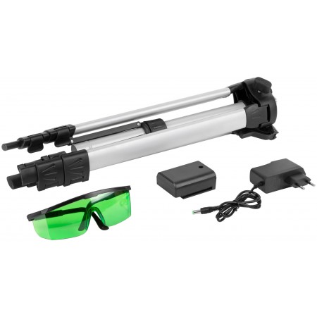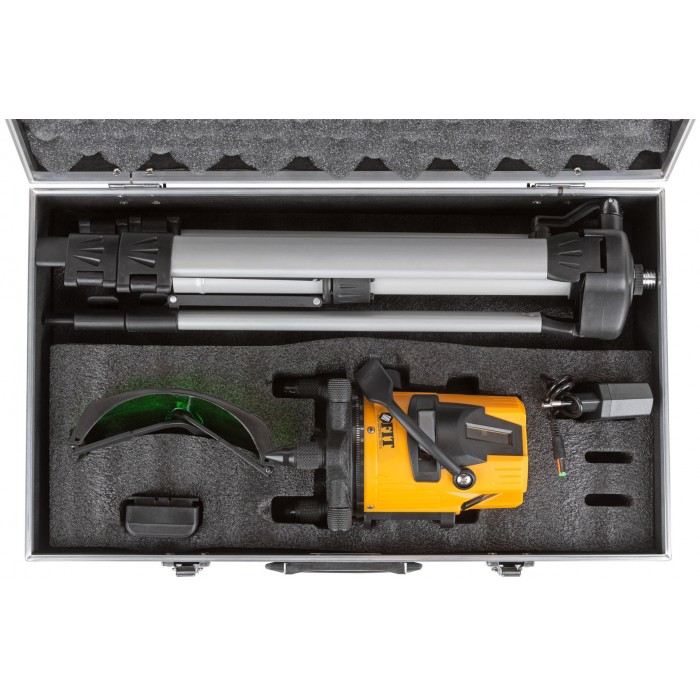 Самоуспокаивающийся. 5 зеленых лучей: 4 вертикальных и 1 горизонтальный. Два уровня яркости луча - для внутренних и наружных работ. Максимальный рабочий диапазон до 20 м в каждую сторону. Функция фиксирования на поверхности креста из лазерных линий (а также отдельно горизонтальной и вертикальной линий). Функция отвеса вверх/вниз. Функция раздельного включения линий. Встроенный пузырьковый уровень. Диапазон компенсирования ±3° для установки на неровную поверхность. Внутренняя подсветка для удобства работы в темноте. Поворотная база с внутренней резьбой 5/8'' для установки на треногу. Градусная шкала на основании и регуляторы для проведения прецизионной настройки положения вертикальных линий. Ремень для удобства переноски. В комплекте: лазерный уровень, алюминиевый кейс с поролоновыми вставками, тренога телескопическая 400-1200 мм, очки, зарядное устройство (220 В / 50 Гц), Li-Ion аккумуляторная батарея. Материал: ударопрочный ABS пластиковый корпус, пластик, алюминиевый сплав, поролон, резина. Упаковка: алюминиевый кейс.