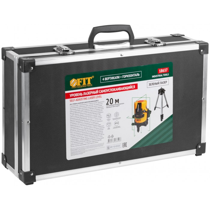 Уровень лазерный самоуспокаивающийся, зеленые лучи, горизонталь + 4 вертикали, диапазон 20 м, Li-Ion аккум., 2 уровня яркости, тренога, алюминиевый ке (18637)