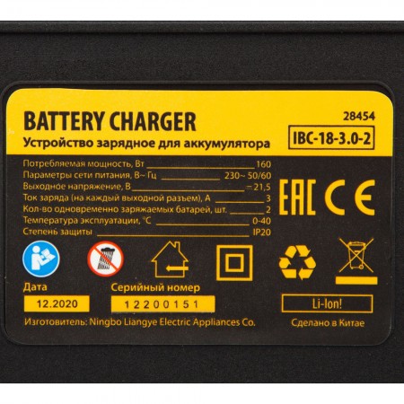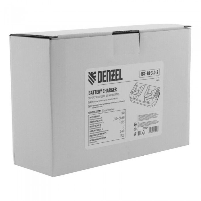 Устройство зарядное для аккумуляторов IBC-18-3.0-2, Li-Ion, 18В, 3.0 А, для двух батарей Denzel (28454)
