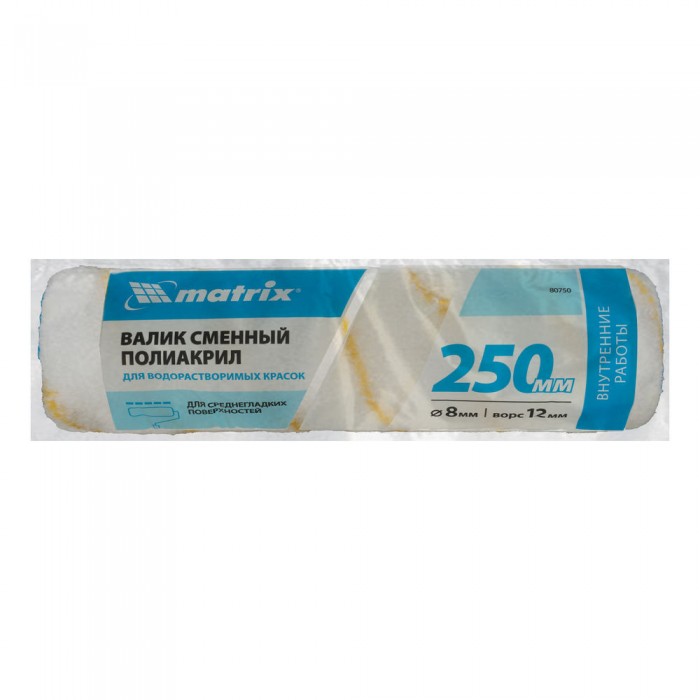 Валик сменный для внутренних работ синтетический, 250 мм, ворс 12 мм, D 48 мм, D ручки 8 мм, полиакрил Matrix (80750)