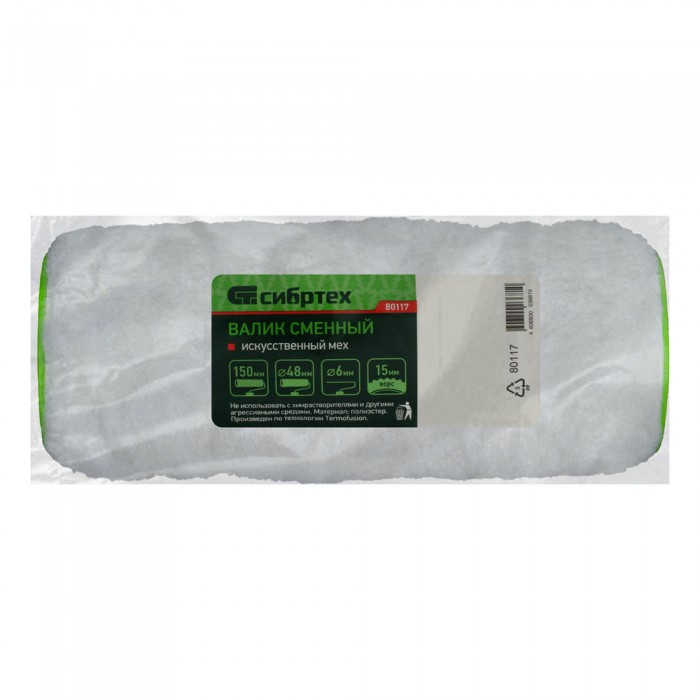 Валик сменный "Искусственный мех" , 150 мм, ворс 15 мм, D 48 мм, D ручки 6 мм, полиэстер Сибртех (80117)