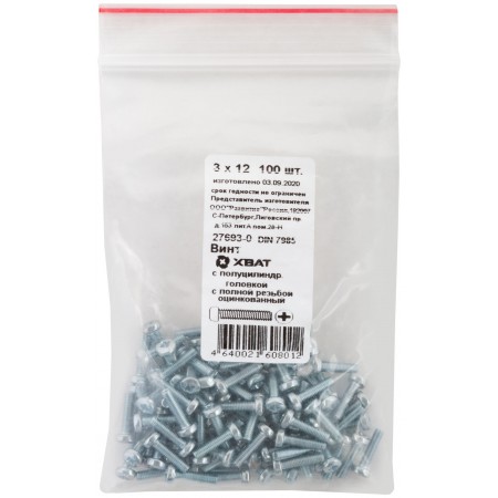 Винт с полуцилиндрич. головкой с полной резьбой оцинков. DIN 7985 3х12 100 шт Фасовка (27693-0)