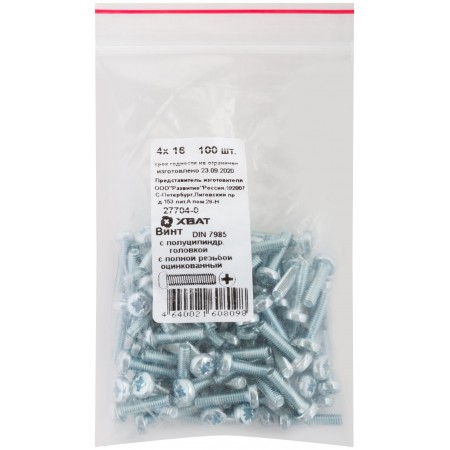 Винт с полуцилиндрич. головкой с полной резьбой оцинков. DIN 7985 4х16 100 шт Фасовка (27704-0)