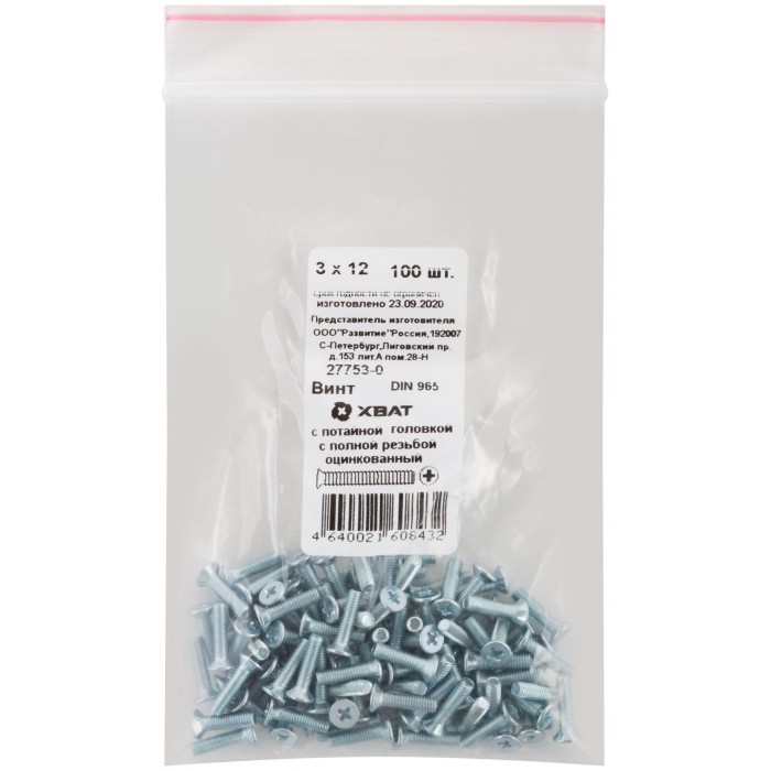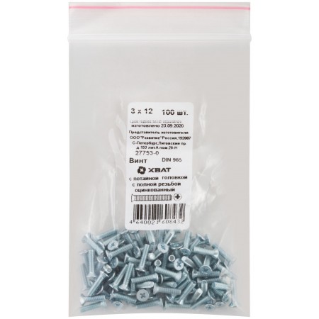 Винт с потайной головкой с полной резьбой оцинкованный DIN 965 3х12 100 шт Фасовка (27753-0)