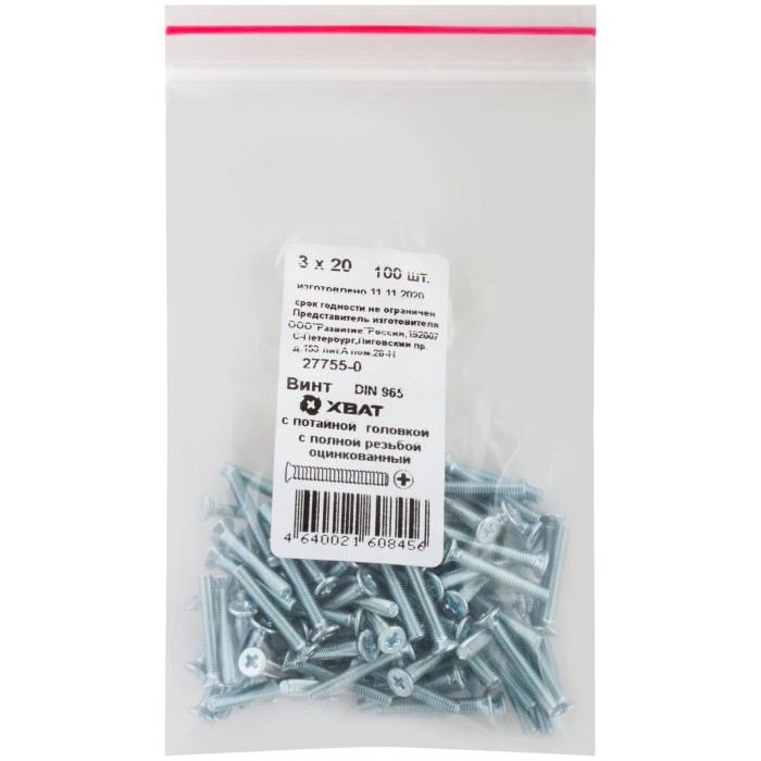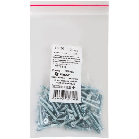 Винт с потайной головкой с полной резьбой оцинкованный DIN 965 3х20 100 шт Фасовка (27755-0)