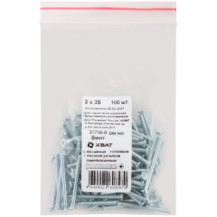 Винт с потайной головкой с полной резьбой оцинкованный DIN 965 3х35 100 шт Фасовка (27756-0)