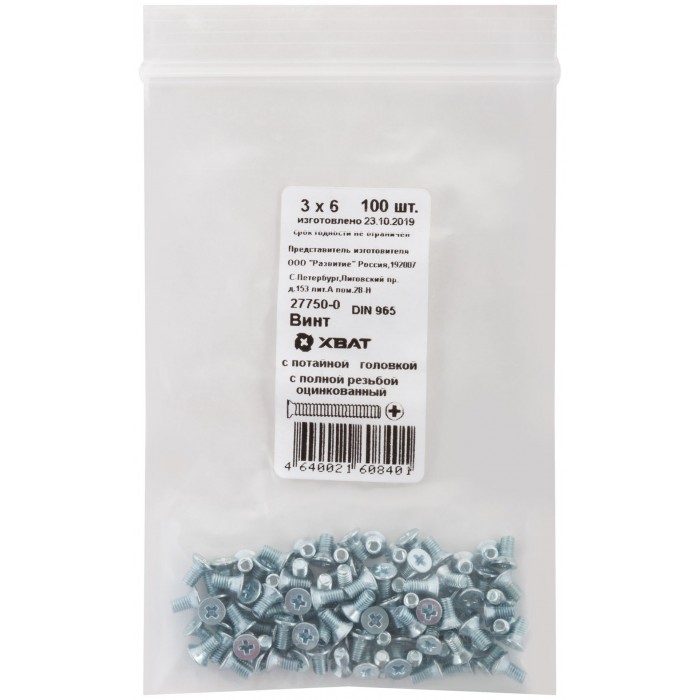 Винт с потайной головкой с полной резьбой оцинкованный DIN 965 3х6 100 шт Фасовка (27750-0)