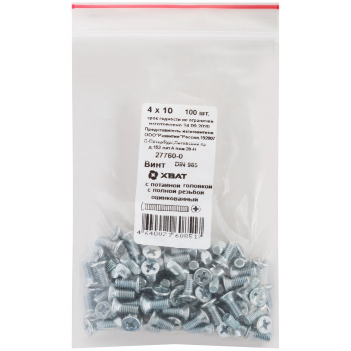 Винт с потайной головкой с полной резьбой оцинкованный DIN 965 4х10 100 шт Фасовка (27760-0)