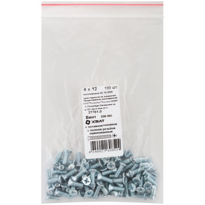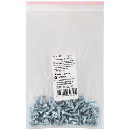 Винт с потайной головкой с полной резьбой оцинкованный DIN 965 4х12 100 шт Фасовка (27761-0)