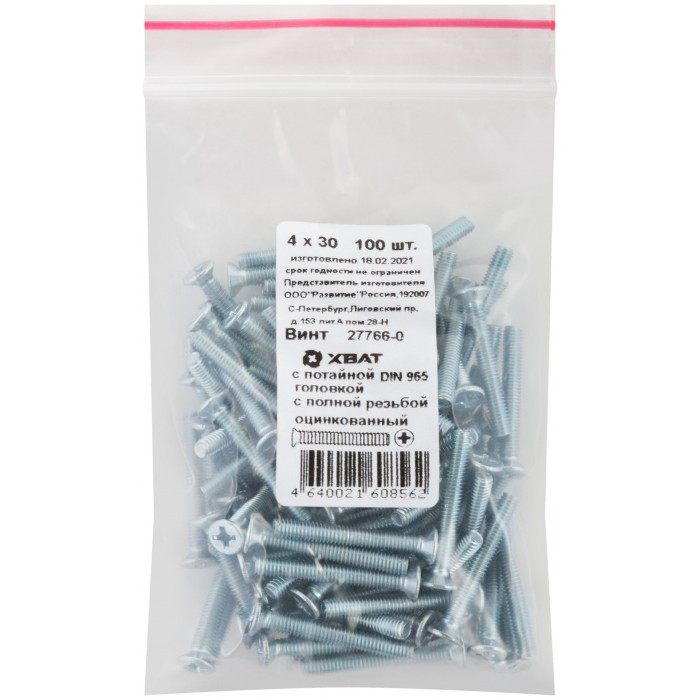 Винт с потайной головкой с полной резьбой оцинкованный DIN 965 4х30 100 шт Фасовка (27766-0)