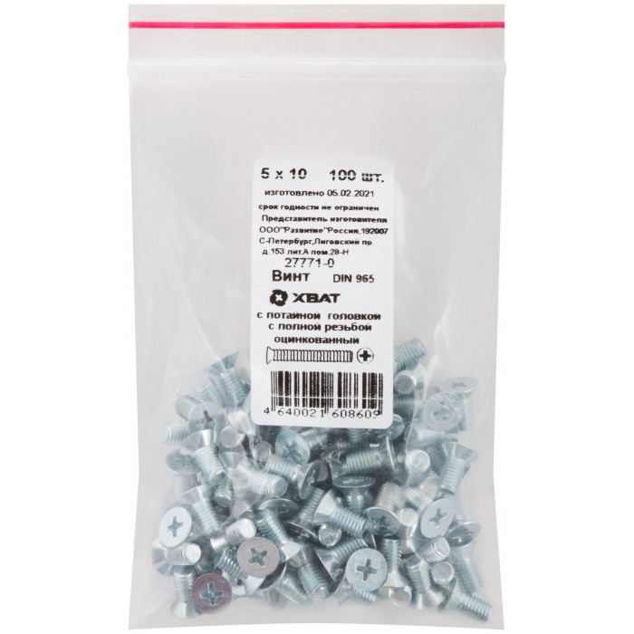 Винт с потайной головкой с полной резьбой оцинкованный DIN 965 5х10 100 шт Фасовка (27771-0)