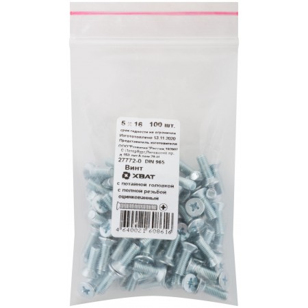 Винт с потайной головкой с полной резьбой оцинкованный DIN 965 5х16 100 шт Фасовка (27772-0)