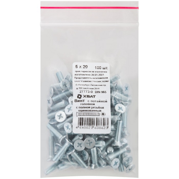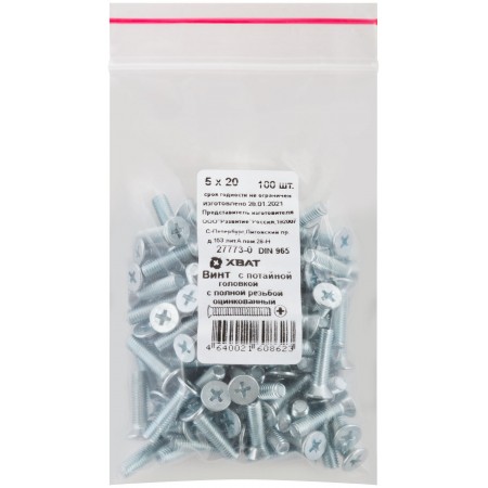 Винт с потайной головкой с полной резьбой оцинкованный DIN 965 5х20 100 шт Фасовка (27773-0)