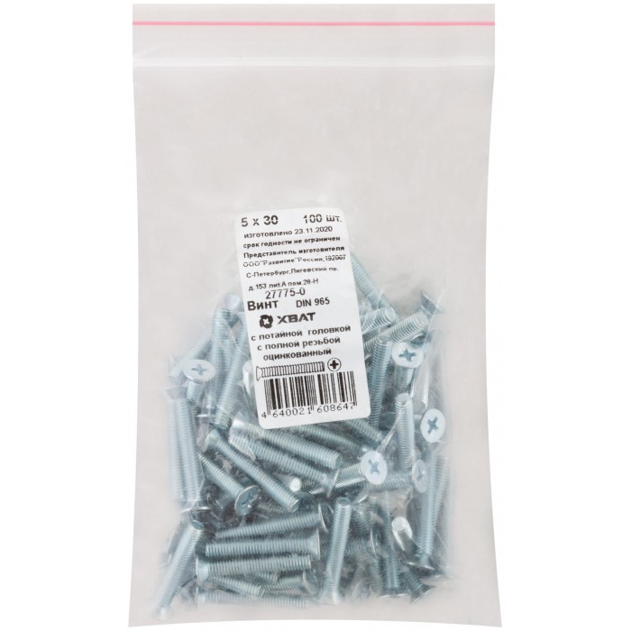 Винт с потайной головкой с полной резьбой оцинкованный DIN 965 5х30 100 шт Фасовка (27775-0)